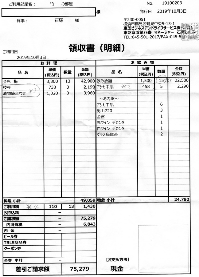添付領収書 *1;「15人」を「13人」に訂正、「第八寮のミス」