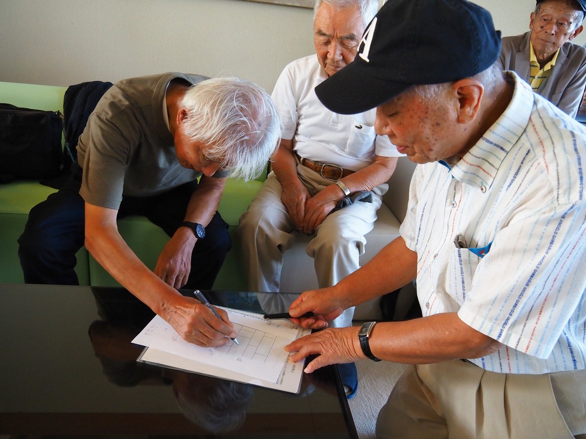 「あみだくじ」だ。爺さん共が童心に還って、次々と線を引いてゆく。