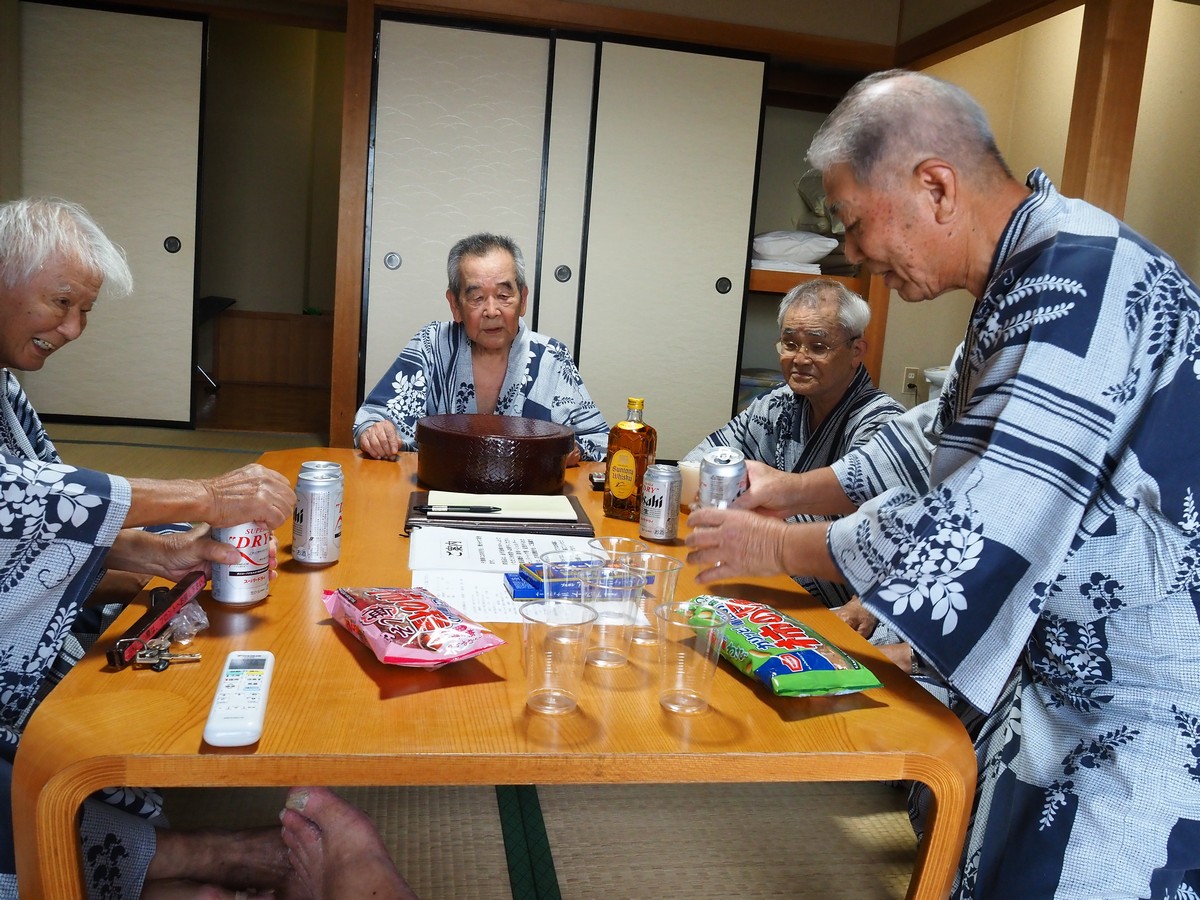 風呂から上がり、石塚さんの部屋に三々五々集まってきた。ビールや角瓶が並べられ、おつまみが色々出てくる。石塚さんが用意して持ってきてくれたもの。