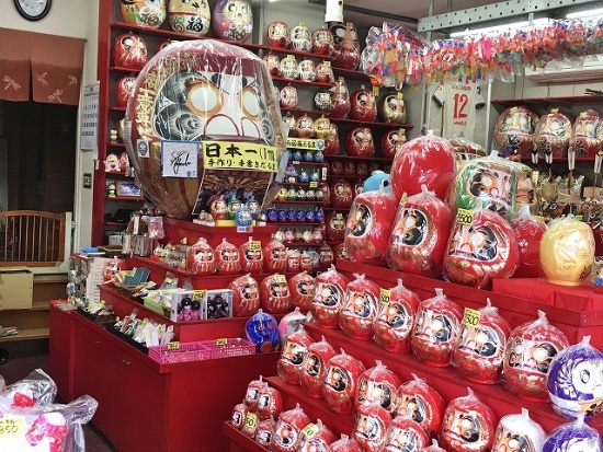 くず餅、のど飴、漬け物、縁起物のだるま、甘酒、中でも日本一大きいだるまと言うのがお店に出ていた。