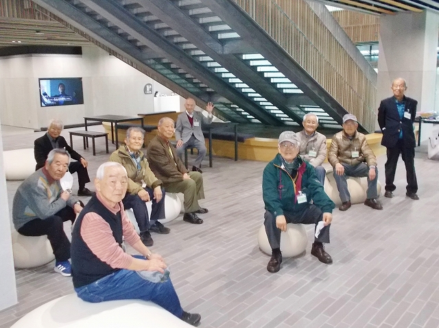 見学に先立って、旧トランジスタ工場の跡地に建てられた北館を背景に記念写真を撮った。