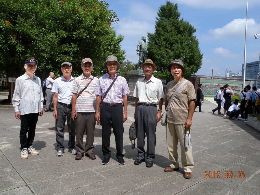 途中、西郷どんの銅像前で(石塚さん撮影)