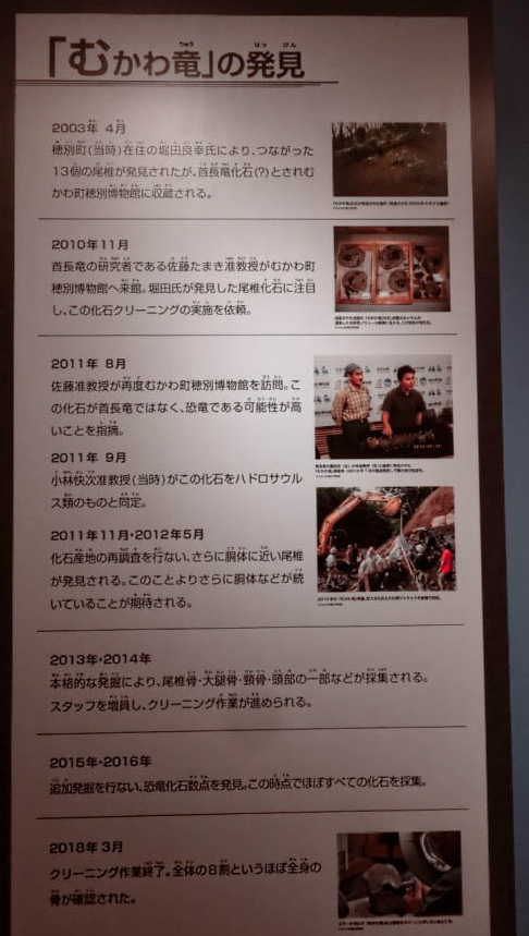 むかわ竜はむかわ町で2003年に発見されました。化石は約7,200万年前(白亜紀後期)の地層で見つかったそうです。