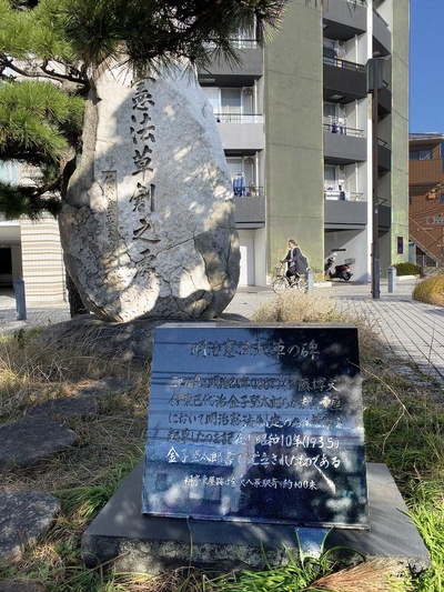 伊藤博文らが明治憲法の起草をした夏島に建立された。 当初はここより200メートル離れた料亭跡地にあったそうである。三八会のある人曰く、昔の偉人は酒を飲みながら憲法を作り、それが今の料亭政治につながっていると。
