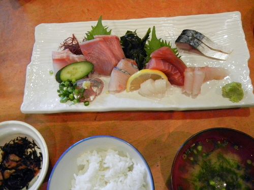 協議の結果、地魚刺し盛り定食1,500円也に決定。かんぱち、あじ、かつお、さわら、さば、ヤリイカなど全て新鮮でコシヒカリのご飯もとても美味い。家の近くにあったら毎週でも来たい店だ。