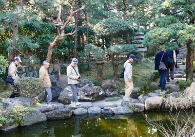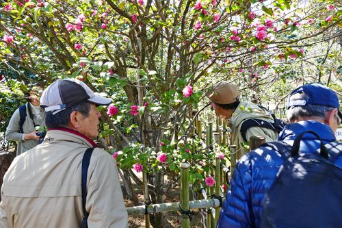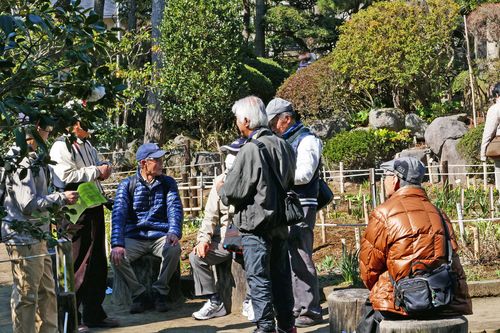 椿の香りを楽しむ面々 水温む池にはメダカが泳ぐ