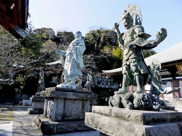 日蓮宗の寺院。本堂の屋根の金色の飾りが美しい。高村光雲作の大きな日蓮聖人の像がある。