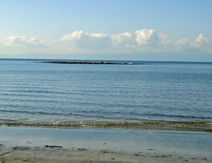 石塚さんが事前に詳細に調べてくれた地図を頼りに住宅街を進むと突然海に出た。これが材木座海岸であった。