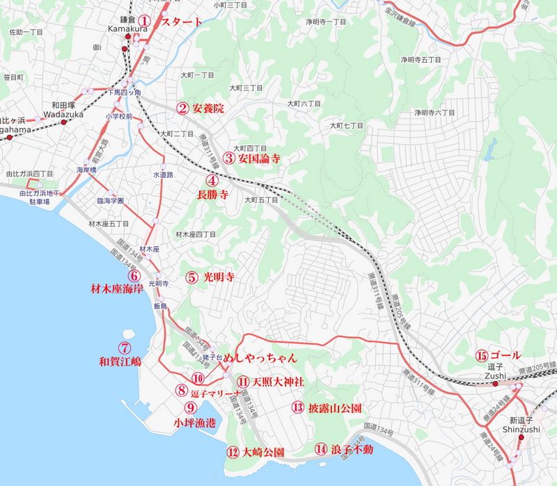 予定のコースは古都鎌倉の寺院参拝と逗子海岸近辺の公園を散策するロマンに満ちたものである。