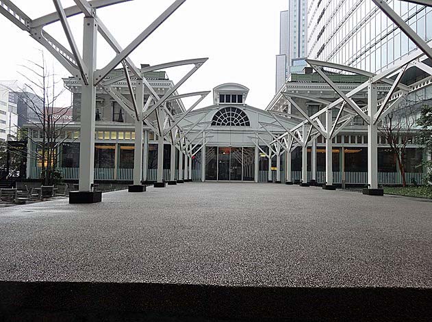 新橋駅から浜離宮恩賜庭園に向かう途中、昔の鉄道唱歌に「汽笛一声新橋を はや我汽車は離れたり」と唱われた旧新橋停留所跡がありました。ここは日本の鉄道発祥の地です。当時のホームの姿が再現されていました。