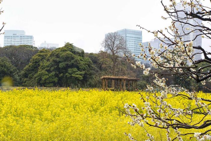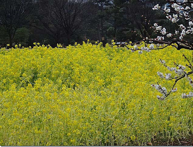 花畑沿いに白梅の木が並び、菜の花と競争するように咲いていたのが印象的でした。