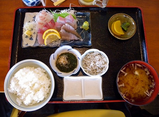 流石は鎌倉、近海物のかんぱち、いなだ、さわら、くろだいの刺身とシラス、モズク、味噌
