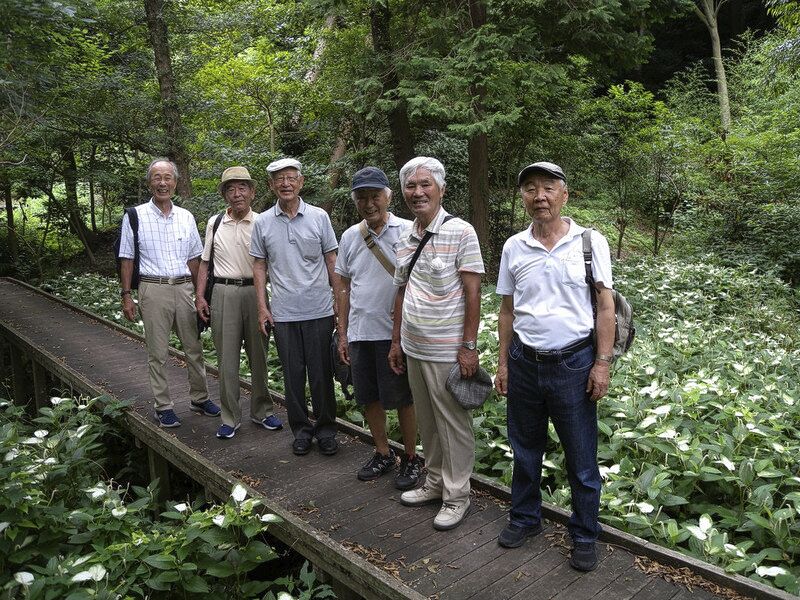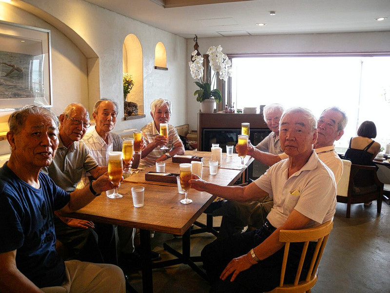 図々しくもオジさん7名が一列に並び写真を撮ろうとした時、親切な客人が「シャッター押しましょう」と言ってくれた。恐縮至極であった。
