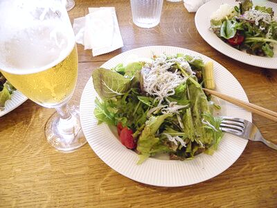 早速、「冷たいコーンスープ」「シラスの乗った野菜サラダの大盛り」「広島産牡蠣の塩味パスタ」と生ビールをオーダー、ビールで乾杯した。