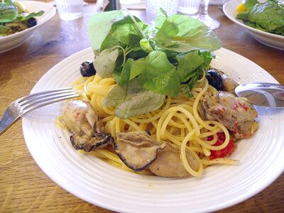 シラスの乗った野菜サラダ 広島産牡蠣の塩味パスタ
