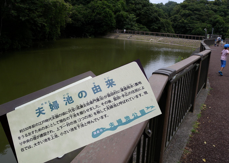 上池と下池が一対になって「夫婦池」と名付けられたようだが、その中央に掛かっている橋から「カワセミ」を撮っている一人の若い女性がいた。