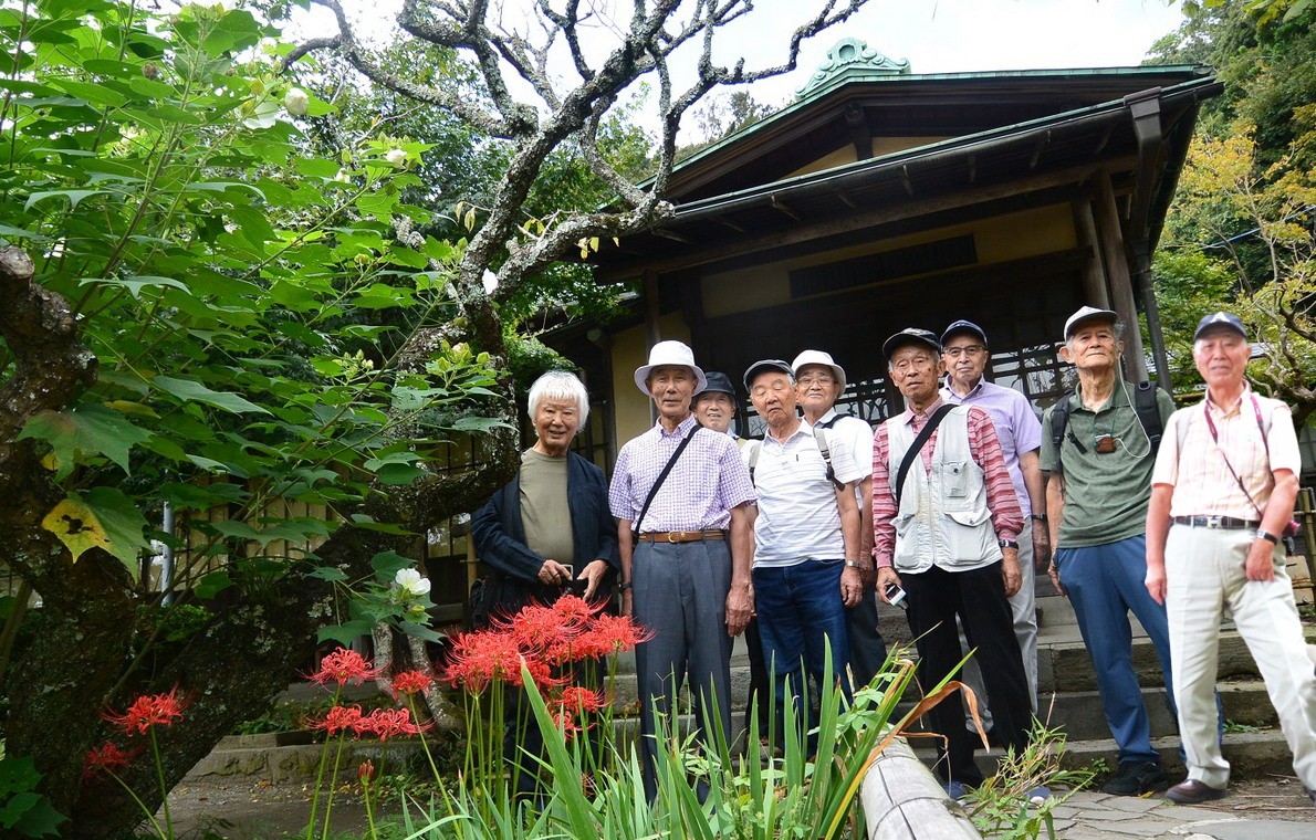 期待していた真っ赤な彼岸花の絨毯は無理筋、しかし、絨毯ではなく所々点々と艶やかに咲き誇る彼岸花、これも風情の一つかと、庫裡の前で庭園散策スタートの集合写真。