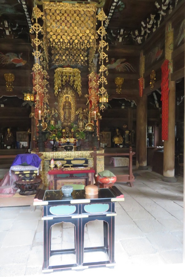 のぞき趣味ではないが止むを得ず小窓から仏殿の内部を覗くに、さすが尼さんのお寺か、その内部は、床は石畳、読経等のお勤めのためかキレイな椅子が配置され、行き届いた清掃、正面の金ぴかの仏様もスッキリと立派、天井にも綺麗な絵が描かれ・・・等々、格式の高さと(綺麗好きな)尼さんのお寺故かと、納得させられるところ多々あり。