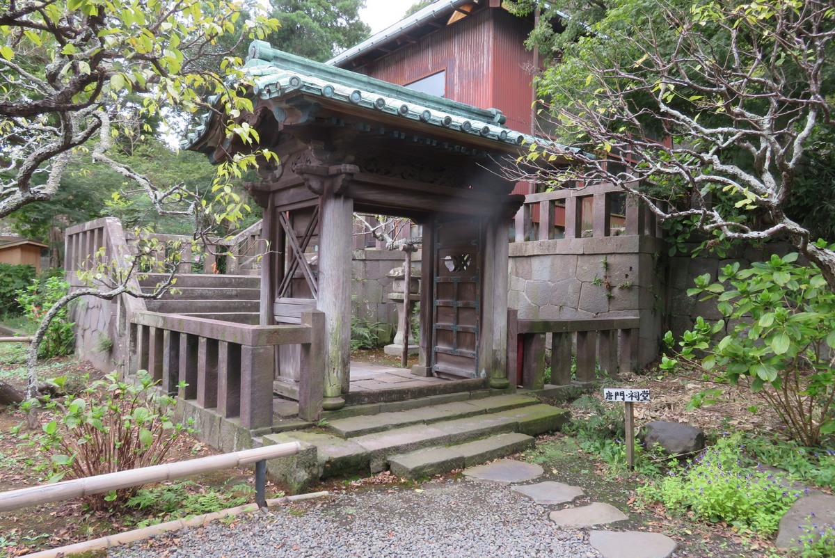 仏殿正面(南向き)の右手前方に小振りだが造りの立派な門が立っている、「唐門」である。英勝寺の開祖である英勝院が祀られている祠堂への入り口であるとのこと。唐門をくぐり抜け急な石段を登ると、ガラス戸付きトタン張りの作業小屋のような建物が正面に。