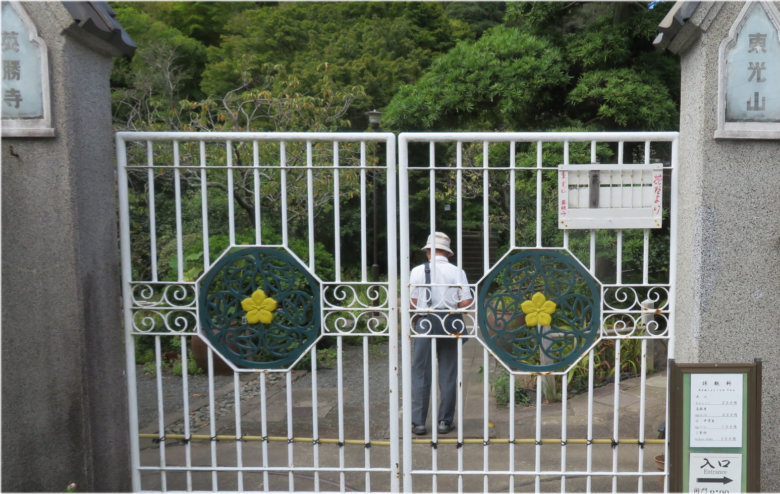 総門前での集合写真パチリの後、ものの一二分で今度は当世風の小洒落たミーハーまがいの白い鉄柵の門に到着、なんとこれが「英勝寺」の通用門であると。門扉の真ん中には花のデザインが配置され、寺の門としては