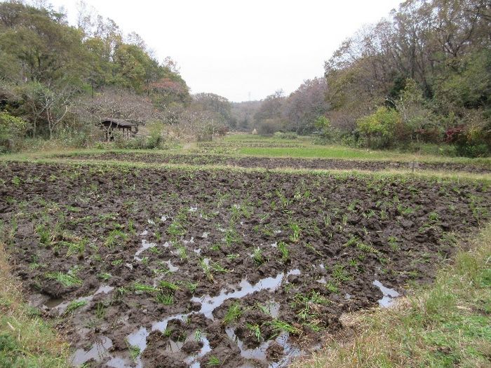 小谷戸の里を出て、夏には蛍が出そうな小川に沿ってさらに下ると、広大な稲刈り後の田んぼ、白菜・ブロッコリー・ネギなどの野菜畑が続いている。市民向けのレンタル畑やナシ園もあり、ここだけで幅広い農業体験ができそう。