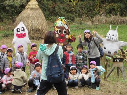紅葉を堪能した後、少し逆戻りして南門を経由し、メイン通路を下ると、稲刈りの終わった広大な田んぼが見えてきた。ここの案山子祭りは有名で、出品された案山子が一堂に集められ、近くで園児たちが先生に引率されてにぎやかに遊んでいる。