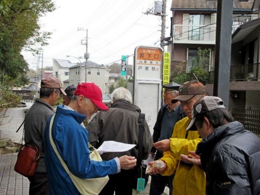 この日は丁度24節季の「小雪」、どうなっても良いように冬装備で午前10時にJR戸塚駅に7名が集合、バスにてバス停京急ニュータウンへ。バス停で奥様の運転でエスコートしてもらった高橋さんと合流。8名がそろった。