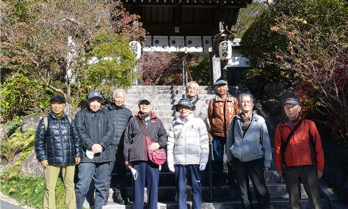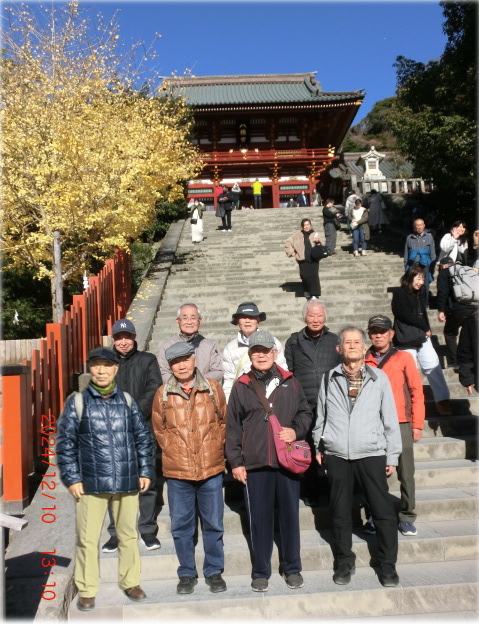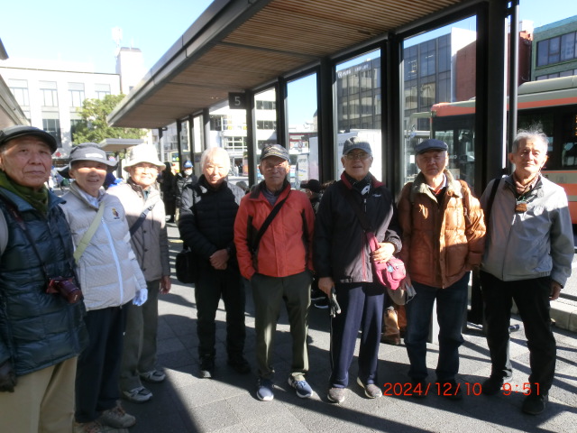 12月10日、朝の気温が5度とようやく冬らしくなった快晴のもと、鎌倉駅に集合、バス停前でまず集合写真を撮った。