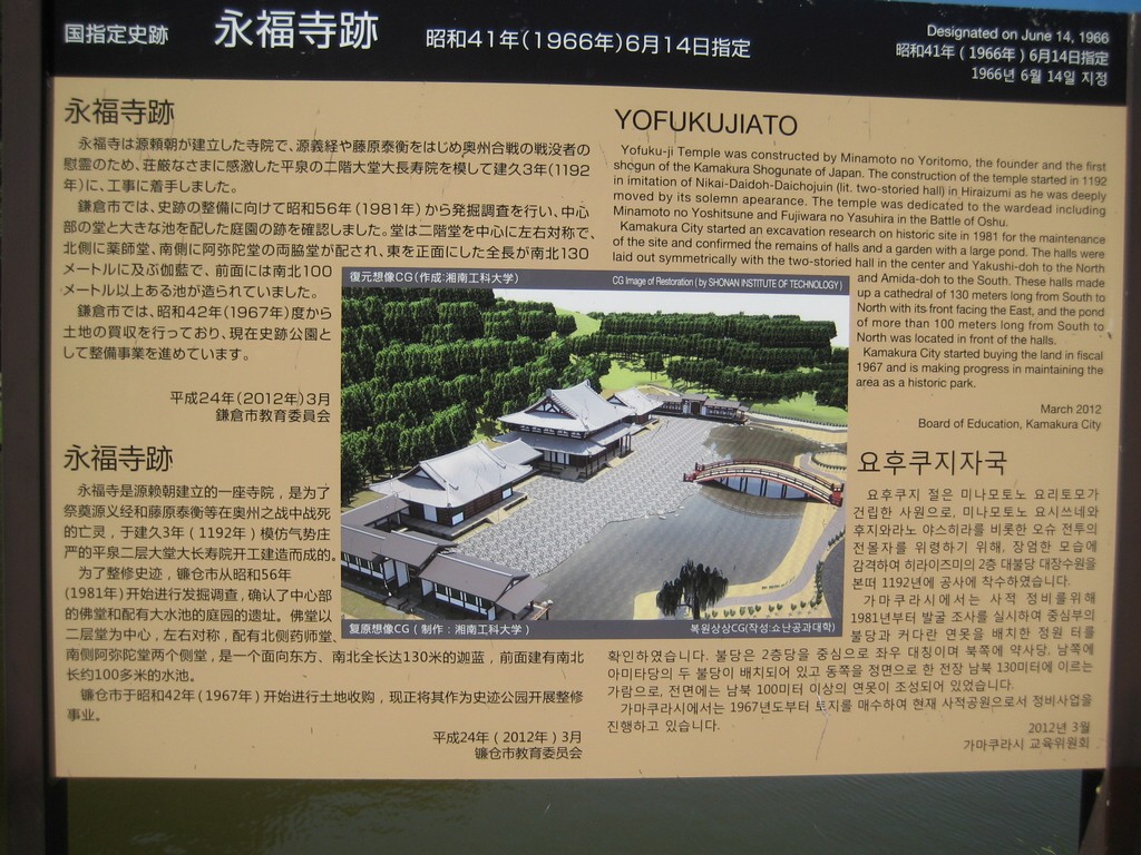 次は、永福寺跡。ここは鎌倉幕府の始まりに源頼朝が建立した寺院跡である。奥州合戦で散った義経や奥州藤原泰衡らの武将達の鎮魂を祈る大寺院であったが、後に焼失した。