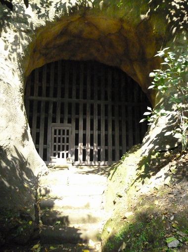 日蓮の弟子の日朗上人が開いたとされる光則寺には、日朗の土牢が残っており、本堂の裏の長い階段を上った先にあった。土牢と聞いて我等が面々は、すぐ現在の大河ドラマの官兵衛を思い浮かべて、城の下の暗い土牢に閉じ込められた官兵衛に較べて、この土牢は、「高台、陽当たり良好、南向きの3DK」並みだとの話に・・・・その入り口と内部。
