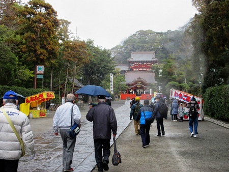 鶴岡八幡宮参拝後、交通整理のおじさんに混雑もしていないのに「参拝の邪魔になるからやめてくれ」と言われながら入口で記念撮影。それにしても鎌倉といえば、人混み・混雑が当たり前であったが、何という人の少なさか。目立つのは修学旅行の子供達だけ。