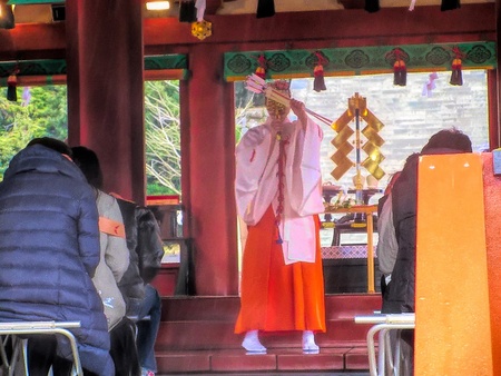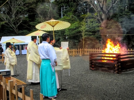 厄払いのお神楽 雨中のお札等お焚きあげ