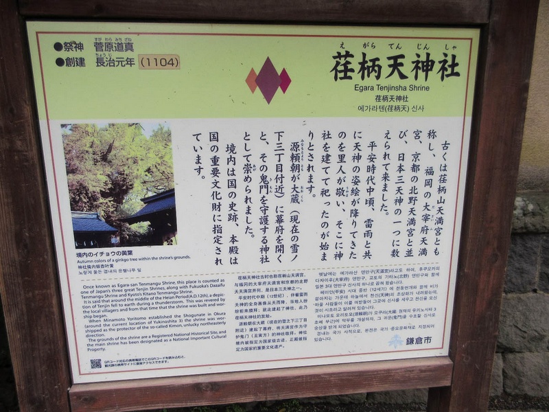 古都鎌倉は道端に色々なモニュメントや遺跡の説明看板があり、いくつかを「つまみ見」しながら次の目的地の荏柄天神へ向かう。