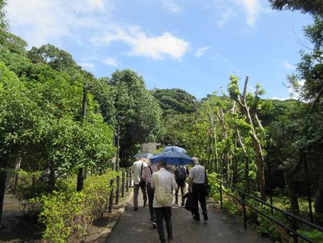 例によって鎌倉駅西口時計台前に10時前に全員集合。直前まで降っていた雨も上がり青空ものぞき始め、ラッキーなスタートとなった。