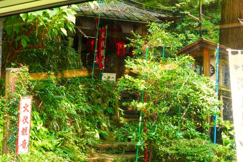三つのスイッチバックを過ぎて塔の沢駅にさしかかる。車窓から火伏観音と深沢銭洗弁財天の境内が見えた。