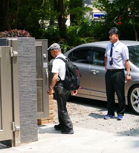東芝芝翠荘前で(写真をクリックで拡大) 玄関前の坂を下る(石塚さん撮影)