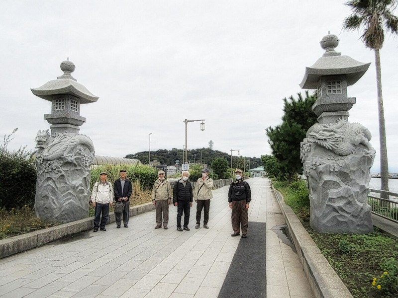 進藤さん以外の6名は江ノ電江の島駅前に集合、そこから歩いて10分程の江の島大橋の入り口で7名全員が揃い、先ずは記念撮影へ。元気の良い運送屋さんのお姉さんにシャッターをお願いした。