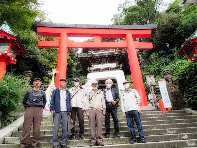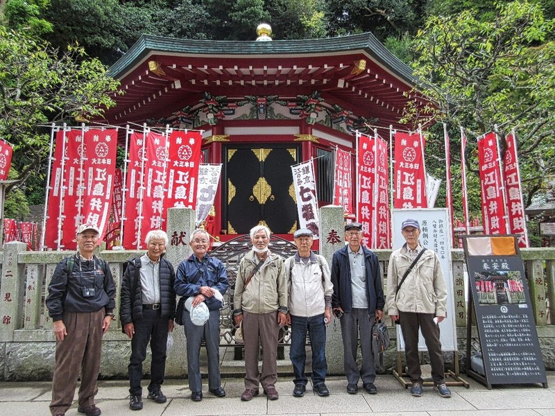 当日9時、久し振りにJR鎌倉駅から江ノ電に乗った。車中からの景色は極楽寺のトンネル、稲村ケ崎の浜辺へ出る踏切、軒下スレスレを通るレストランのベランダなど見覚えのある所が多く、鎌倉を中心とする湘南はまさに山八会のホームグランドの感。
