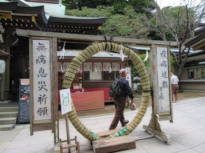 辺津宮で山八会を代表して息災祈願の3回茅の輪くぐりをする石塚さん