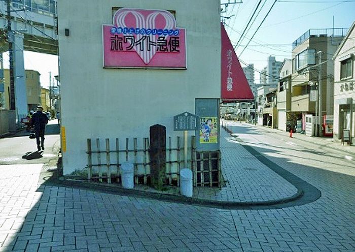 しかし、これらの道磦も時代の流れ都市化の狭間に埋もれかかっている。分岐点に建つクリーニング店の看板が鬱陶しい。
