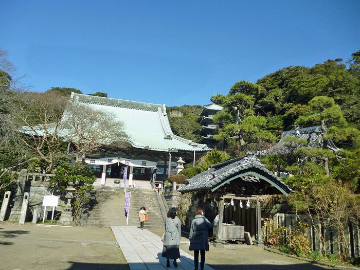 小動神社(こゆるぎ)は、文治年間(1185~90)、江ノ島詣でに訪れた佐々木盛綱が、近江の八王子宮を勧請したのが始まりという。赤いほっかむりをした狛犬は地元の漁師の寄進。小動神社の建つ小動岬には、風もないのに揺れる松があり、「こゆるぎの松」と呼ばれていたことから、「小動」の名が付いたといわれる。盛綱はこの松を「天女遊戯の霊木」と称賛したという。