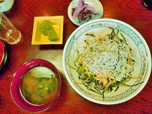 ビールで乾杯の後、しらす三昧セット「こゆるぎ」を皆で食べる。新鮮な、しらすの丼とかき揚は、実に美味しかった。