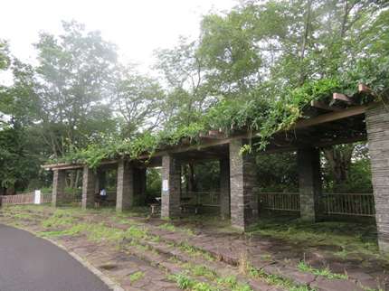 100段ほどの階段と坂道を上ると広場に出る。少しの坂でも息が切れ、前方に休憩所があり早速一休み。樹木が比較的多いが、合間から芝生広場が見える。
