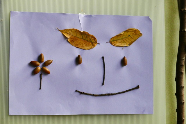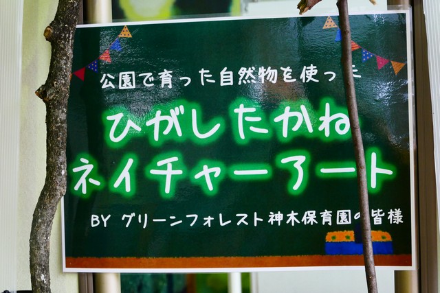 近所の保育園児が公園で拾った葉っぱや木の実でつくった作品もあった*