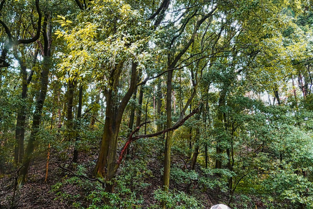 ほどなく、見晴台に到着。雨上がりの空模様で遠方を望むのは無理にしても、木の枝越しに古代芝生広場が望める。