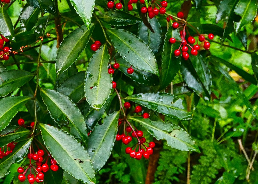 シラカシ林を左手にさらに公園を奥に進むと湿生植物園が出てくる。谷戸を流れる小川を利用して多摩丘陵の湿生植物や野草が群生する。この季節で目についたのはセンリョウやマンリョウなどであった。