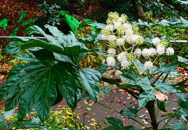 途中で石塚さんが花を咲かせているヤツデを見つける。日陰に耐える強い木で縁起木なのだそうだ。