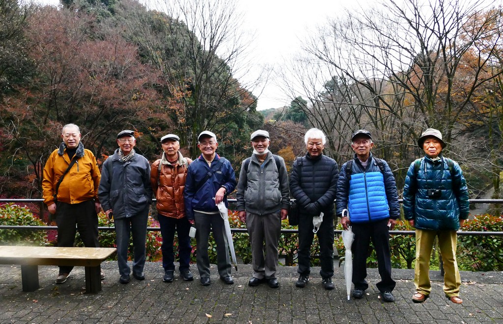 見晴台で2度目の全員集合写真をとった。ここまで1時間ほど歩き続けているがそれほど疲れた様子を示す人はなく、雨も上がり、薄日が差してきて皆気分を良くしているようだ。