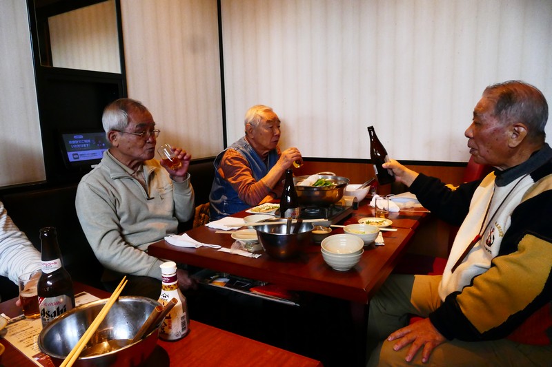 八十歳を越えたと思われぬ食いっぷり、飲みっぷりの老人達は、酒と料理を次々に平らげ、最後にはホタテ鍋に
