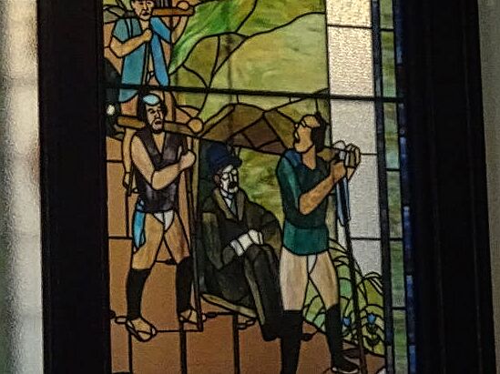 大広間のステントグラス 箱根を籠で越える外国人が描かれている